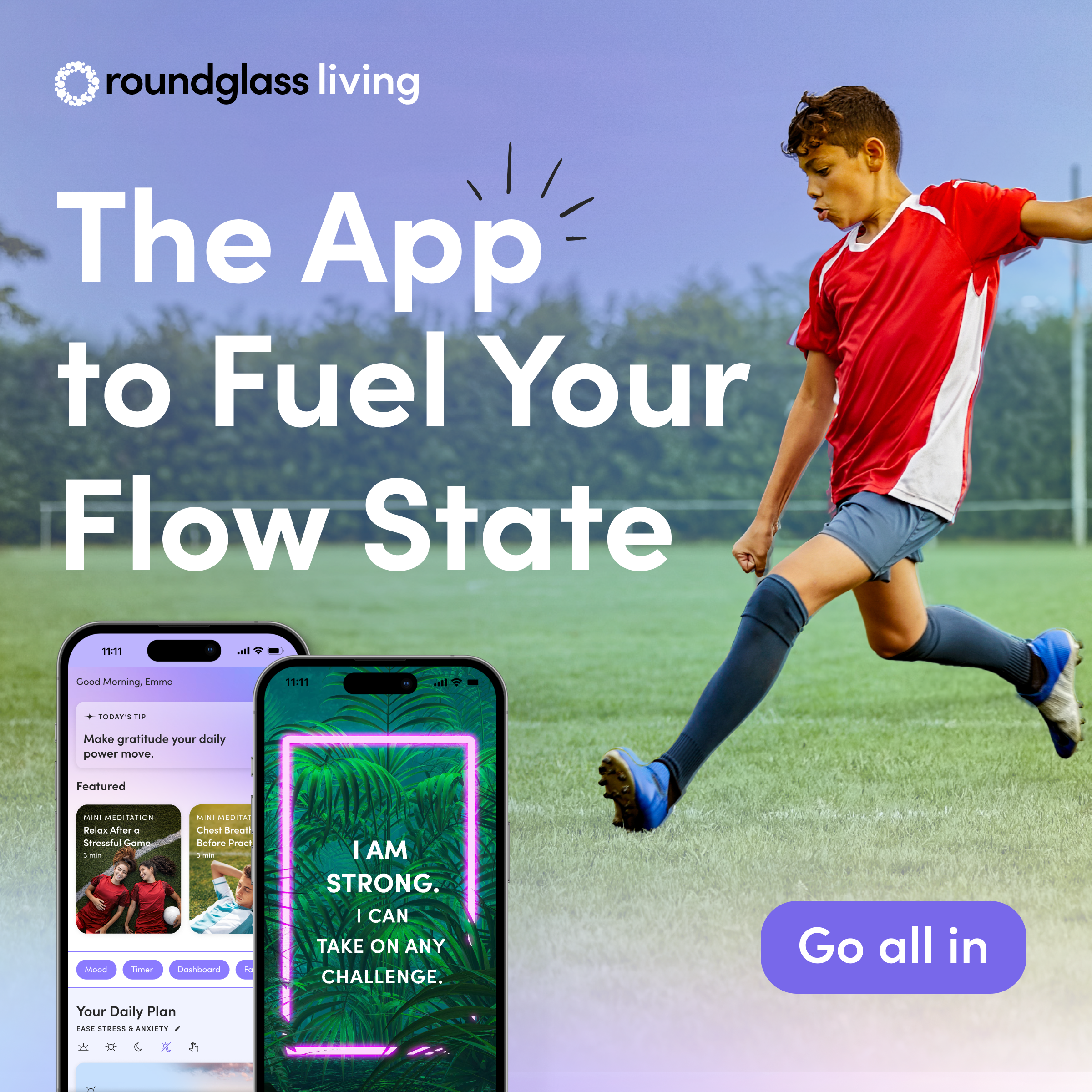 At Delaware Youth Soccer Association, we’re committed to taking care of every aspect of your wellbeing, not just your physical health. That’s why we’re thrilled to announce our new partnership with Roundglass Living a Wholistic Wellbeing app full of neuroscience-backed practices and behavioral science tools to help our staff and athletes be their best selves and realize their full potential—on and off the field.